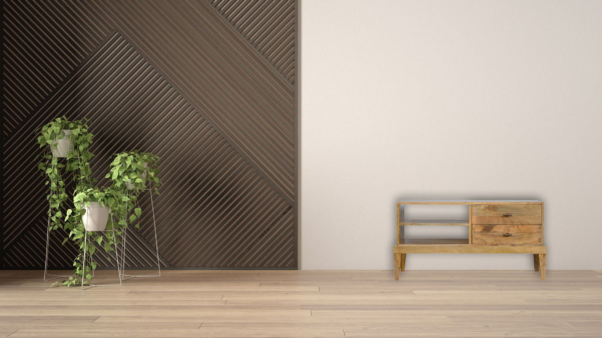 This 2 drawer, open slot media unit takes a slightly different twist on furniture. Featuring a raised platform base with 4 Nordic style legs and 2 handy drawers featuring T-Bar knobs for storing any bits like CD’s, magazine to ornaments and photo frames whilst lounging in the living room. It has been constructed from 100% solid mango wood and has a fine oak-ish finish. The perfect addition to the living room.