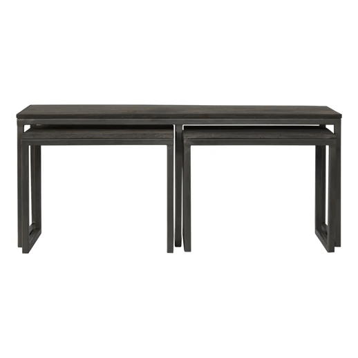 This coffee table features a set of 2 nesting tables has a iron base and is the top is constructed from 100% solid mango wood. The solid wood top has a fine sandblast finish and the base has a pewter finish. A very practical piece of furniture that will sit perfectly in the center of your living room.