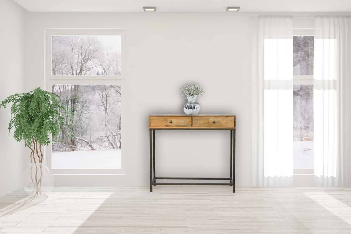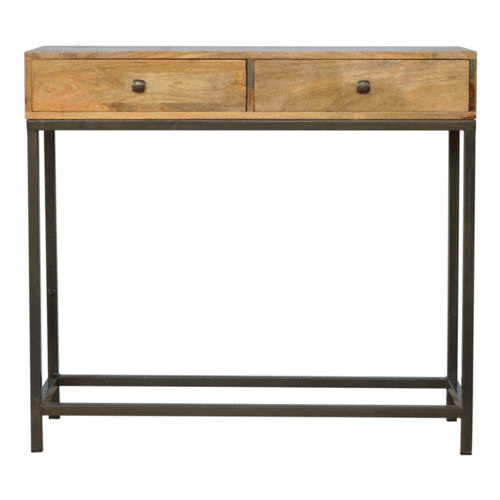 Enhance your hallway with this stylish 2-drawer console table, perfect for adding extra surface area and storage without taking up too much space. Its slim profile makes it an ideal fit for narrow areas. Crafted with a solid mango wood top and drawers, this piece offers durability and natural beauty, complemented by a sleek oak-inspired finish. The sturdy base and legs are made from 100% iron with a sophisticated pewter finish, featuring straight legs and round, polished knob handles for a modern touch.