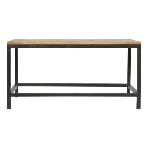 This rectangular coffee table has a refined shape and is topped by a lovely smooth oak-ish finish. The perfect way to show off an industrial style design, this modern coffee table fits into any type of interior. The top is constructed from 100% solid mango wood and the base/legs are made from 100% metal iron which have a pewter finish.