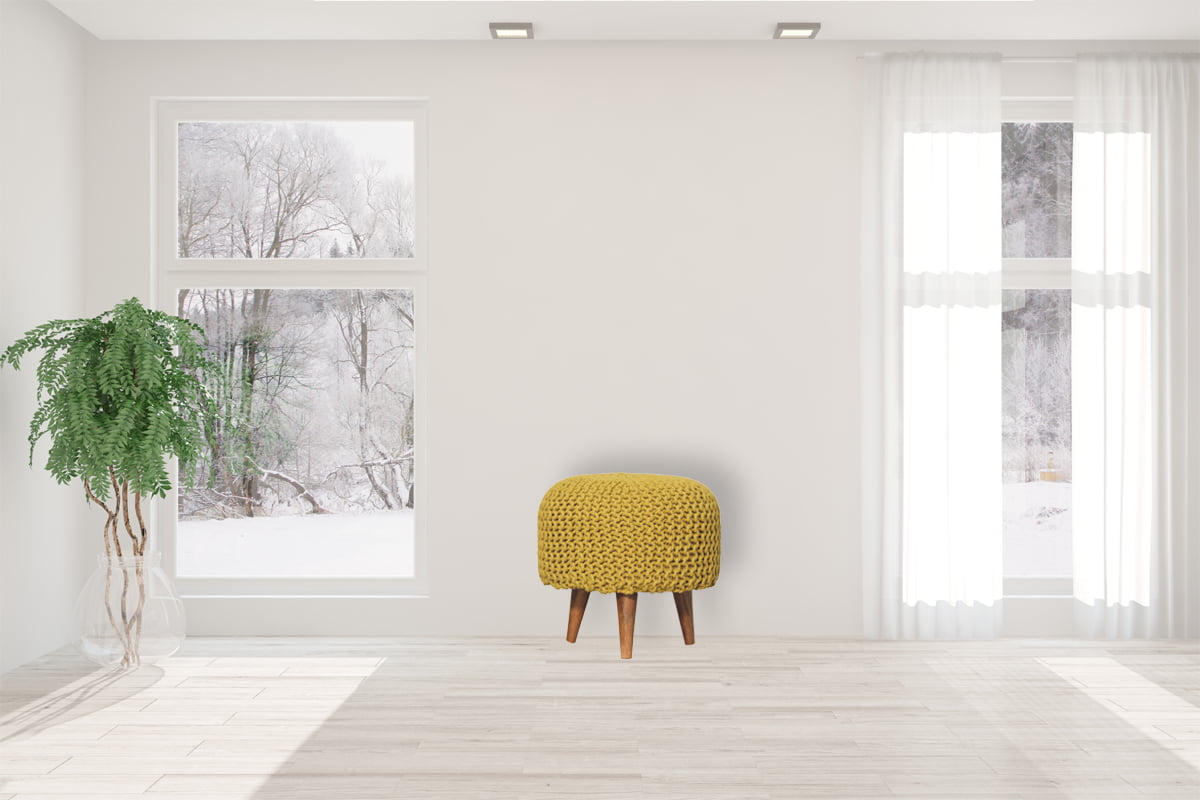 This stylish round footstool combines elegance with compact functionality, making it an ideal accent for any room decor. Lightweight and easy to move, it offers both stability and durability for lasting use. Featuring Nordic-inspired legs with a warm oak finish and a charming mustard woven top, this footstool brings a clean, modern touch to your space.
