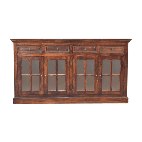 Crafted from 100% solid mango wood, this countryside sideboard features a stunning light walnut finish achieved through a meticulous multi-stage hot-dip caustic wash process. It offers ample storage with four glazed doors revealing spacious shelves, alongside four drawers perfect for organizing special ornaments, photos, and more. Each door and drawer is accented with elegant, shiny round knob handles, combining functionality with timeless rustic charm.