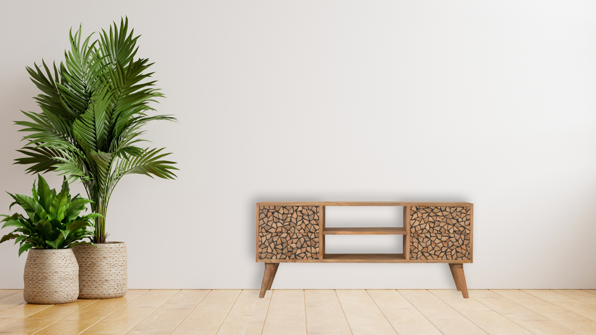 Crafted from 100% solid mango wood with a warm oak-inspired finish, this media unit combines durability with timeless style. It features two spacious drawers and two open compartments, providing versatile storage options. The unit is elevated on sleek Nordic-style legs and accented with polished brass knobs, creating a striking contrast that enhances its elegant design. Explore more pieces from the Lisbon collection to complete your look.