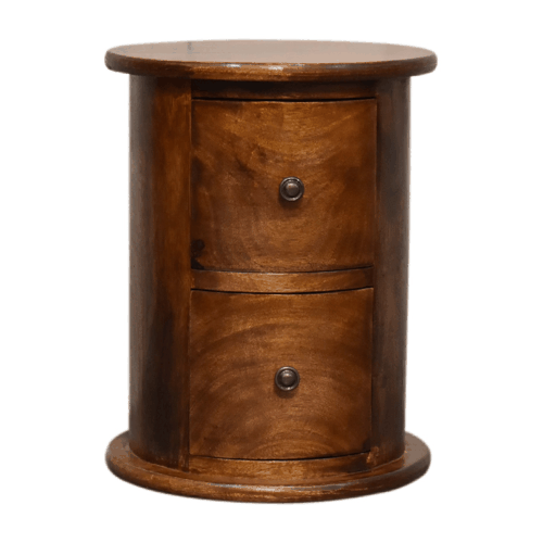 Add a charming touch to your space with this adorable mini round 2-drawer drum chest, crafted from 100% solid mango wood. Featuring a rich chestnut finish and polished drawer knobs, this country-style piece is perfect for organizing small essentials like keys and loose change. The top surface provides an ideal spot to showcase photos, ornaments, or collectibles. Versatile and compact, it works beautifully as a bedside table, end table, or occasional table. This delightful piece is part of the Recession Collection.