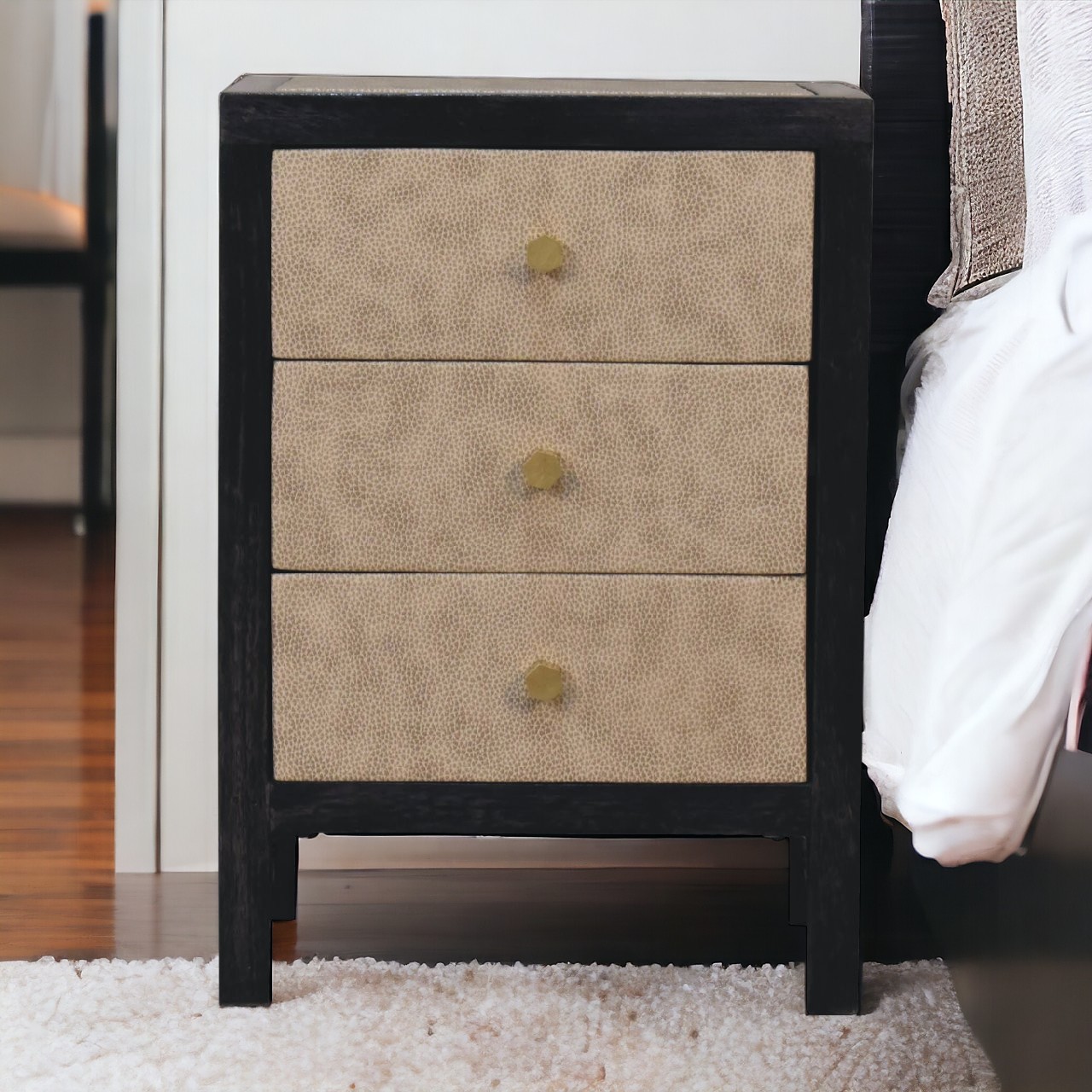Elevate your bedroom with this stylish mini bedside table, featuring a sleek wooden frame finished in elegant ash black. The surface is beautifully wrapped in luxurious faux leather, adding a touch of sophistication to your space. Accented with three glossy candle-shaped knobs, this piece combines functionality with distinctive design. Part of the exclusive Recession Collection, it’s the perfect statement addition to your bedside.
