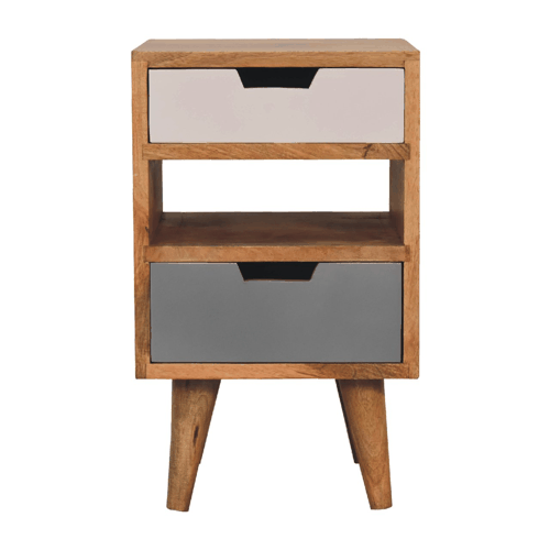 Introducing our mini bedside table, crafted from 100% solid mango wood with a beautiful oak-inspired finish. Featuring a stylish white and grey gradient design, this compact piece stands on four Nordic-style legs, adding a touch of Scandinavian elegance to your bedroom. It includes two hand-painted drawers in coordinating grey and white tones, plus a convenient middle shelf for extra storage. Perfect as a standalone piece or paired with other items from the Recession Collection, this bedside table is a versatile and charming addition to any home.