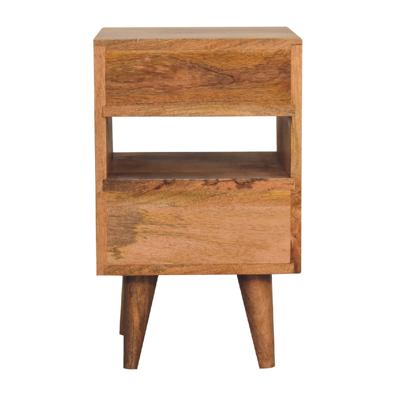Introducing our mini bedside table, crafted from 100% solid mango wood with a beautiful oak-inspired finish. Featuring a stylish white and grey gradient design, this compact piece stands on four Nordic-style legs, adding a touch of Scandinavian elegance to your bedroom. It includes two hand-painted drawers in coordinating grey and white tones, plus a convenient middle shelf for extra storage. Perfect as a standalone piece or paired with other items from the Recession Collection, this bedside table is a versatile and charming addition to any home.