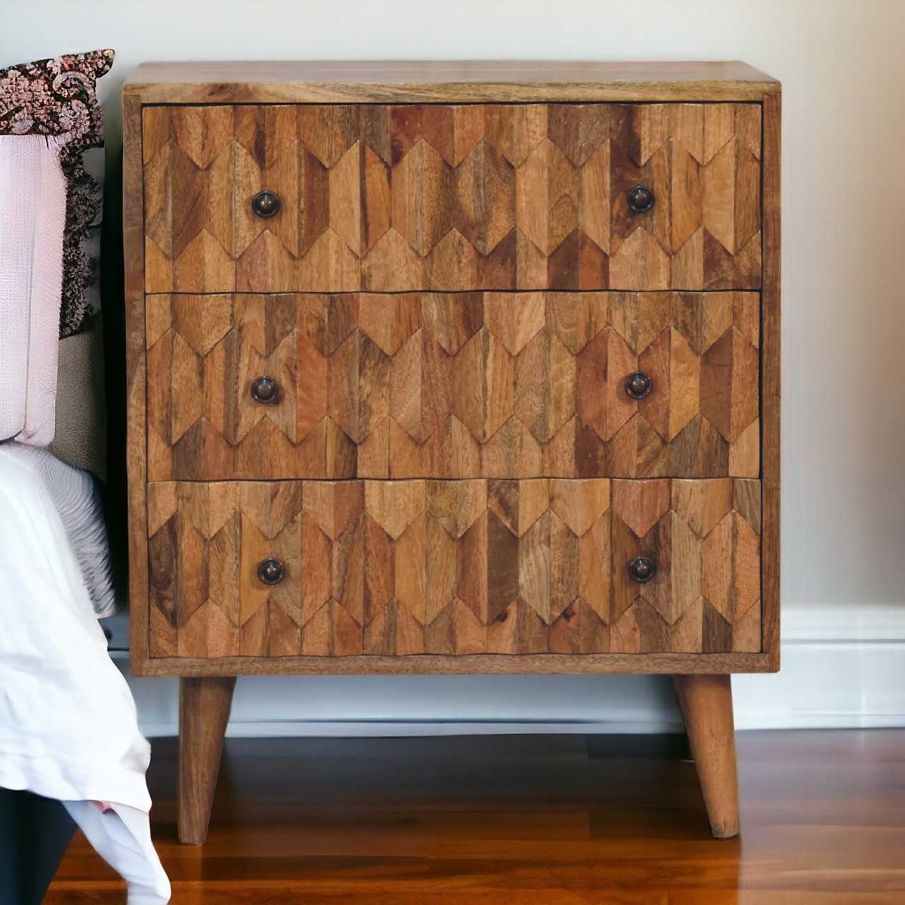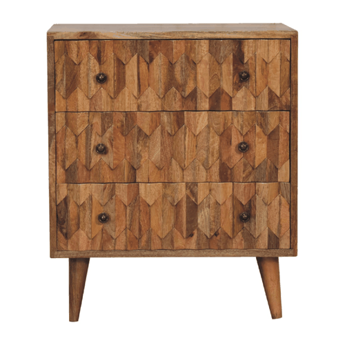 This mini chest of drawers has been constructed from 100% solid mango wood and has a fine oak-ish finish. Its unique design offers useful storage space with 3 spacious drawers to take care of everyday utility items. It features shiny knobs, 4 Nordic style feet, and mainly the beautiful pineapple hand carved design on the drawers giving the product a unique look. This petite product is a part of Recession Collection.