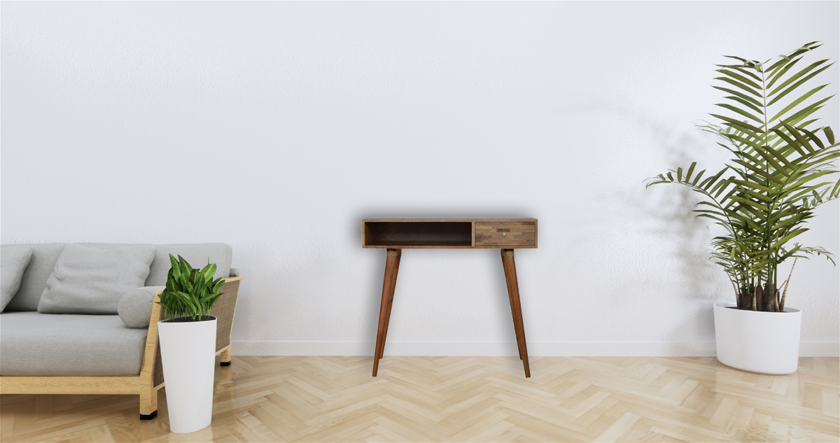 This writing desk combines contemporary design with versatile functionality, perfect for modern interiors. Crafted from 100% solid mango wood, it features a warm oak-inspired finish protected by a clear lacquer for long-lasting durability. The drawer front showcases a unique, mixed-wood pattern accented by a charming candle knob, complemented by an open storage slot for added convenience. Ideal as a standalone piece or paired with other items from the collection, this desk brings both style and practicality to your home.