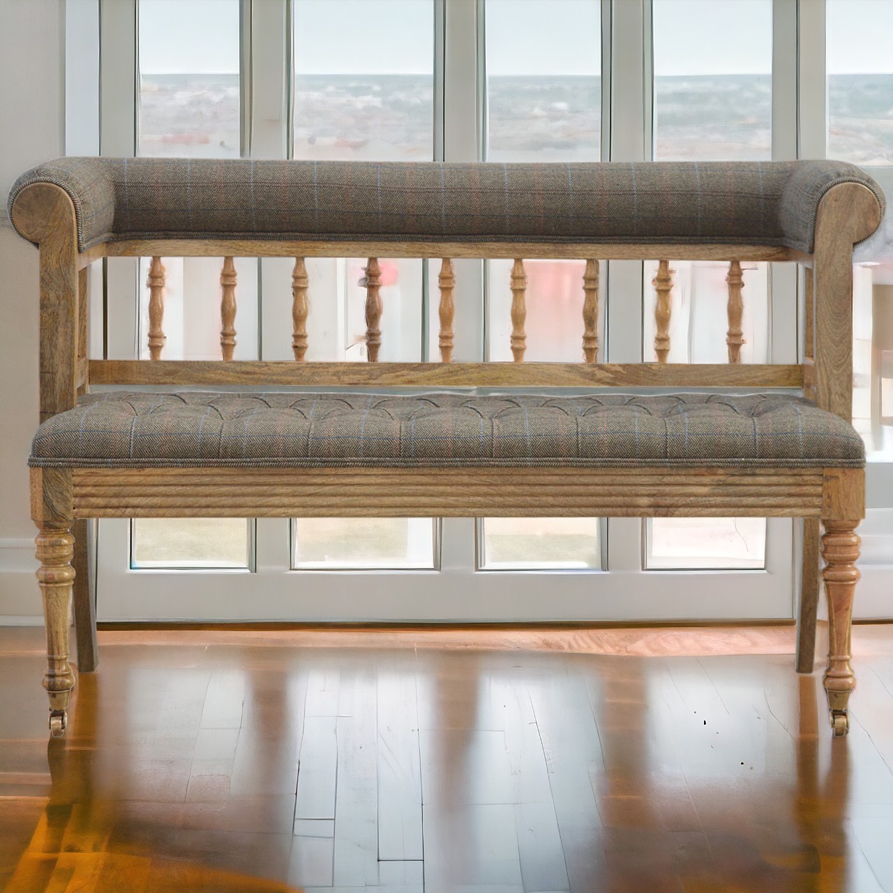 Elevate your home’s living space with this exquisite country tweed hallway bench, designed to bring a touch of refined luxury to any setting. Crafted from 100% solid mango wood, it features a rich oak-inspired finish that highlights the natural beauty of the wood grain. The seat is upholstered in premium 100% multi tweed fabric, offering both comfort and timeless style. Elegant antique studs accent the upholstery, while the front legs showcase intricate hand-carved details and hand-turned craftsmanship, complete with smooth-rolling casters for effortless mobility. Please note, due to the handcrafted nature and natural materials, slight variations may occur between batches. For perfectly coordinated room settings, consider placing a bespoke order or carefully review potential differences before purchasing.