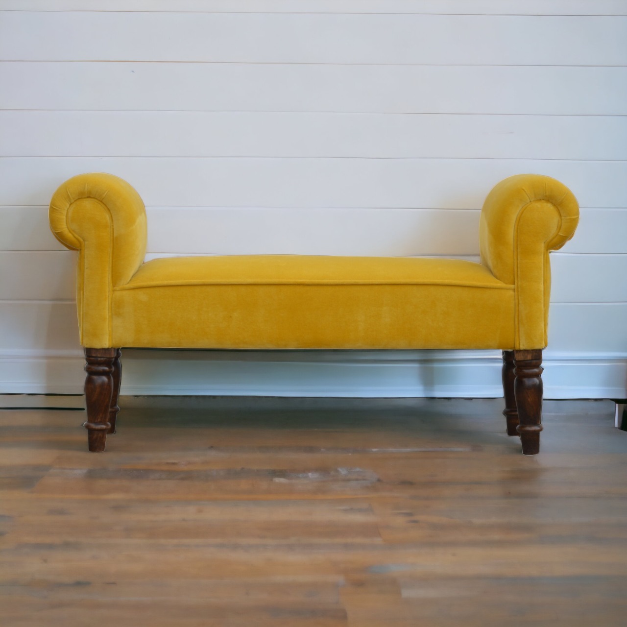 Add a vibrant touch to your home with this charming bench, perfect for hallways, the end of your bed, or any living space where extra seating is needed. Upholstered in luxurious mustard yellow cotton velvet, it features elegantly turned legs crafted from 100% solid mango wood with a rich walnut finish. Available in a variety of colors, this versatile bench combines style and functionality, making it a delightful accent piece for any room.