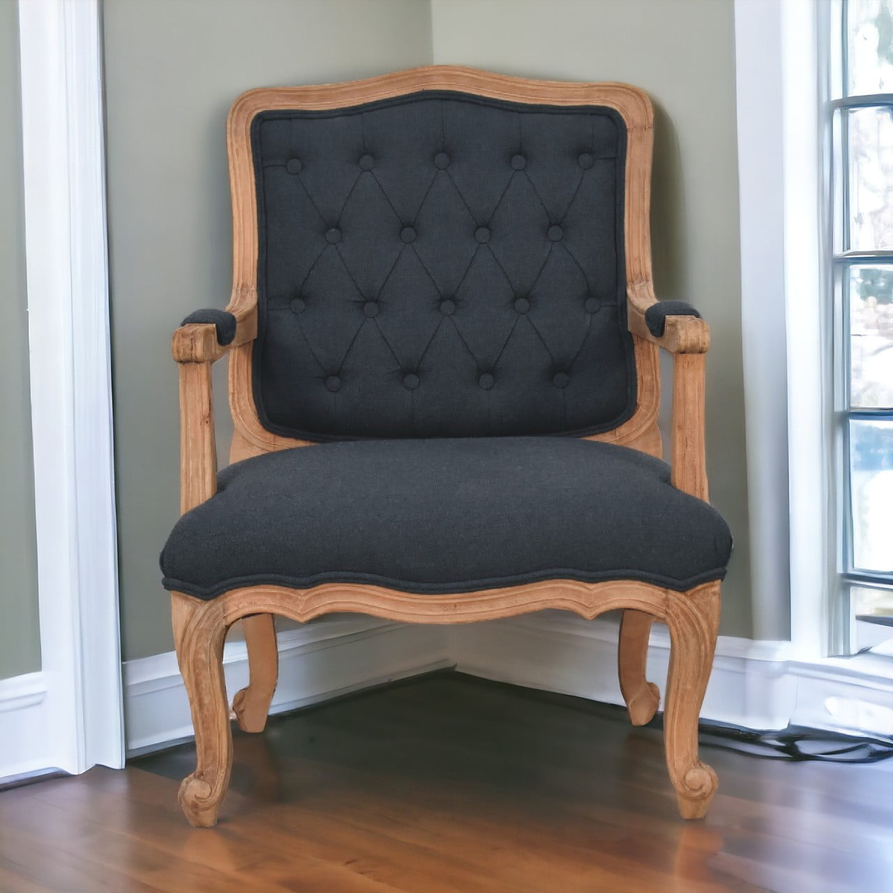 This sophisticated chair is upholstered in navy blue cotton-linen fabric, combining comfort with style. It showcases beautifully carved French-style cabriole legs made from 100% solid mango wood, finished in a sunbleached tone for added durability and charm. Its timeless design makes it a versatile addition to a variety of home interiors.
