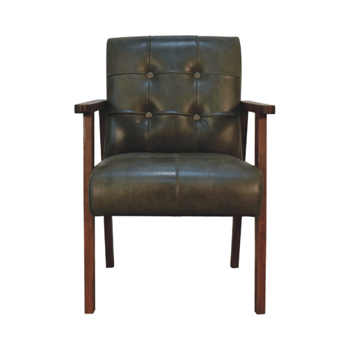 This contemporary armchair is certain to add a sophisticated look & lavish living room or dining room experience. Made from quality buffalo hide leather it is upholstered in a rich olive green colour with a plump seat, and a deep button back cushion. The legs and arms are constructed from 100% solid mango wood in a walnut finish. We hope you love it as much as we do.