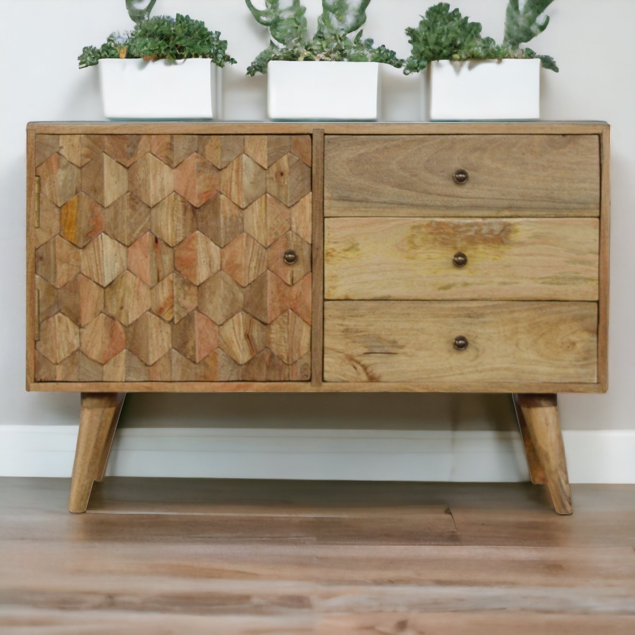 Add this sideboard to your living room, or bedroom. Standing on 4 Nordic style legs it features 1 large cabinet door and 3 drawers which each have 1 shiny knob. This is a very stylish and versatile piece that features a hand-carved pineapple design on the wood which can match any style of interior and could go nicely with a variety of different colours and finishes. This piece can stand alone or can be completed with the matching collection which includes a writing desk, cabinet, chest, and bedside table.