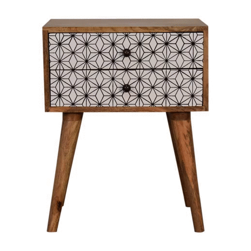 This 2 drawer bedside has been constructed from 100% solid mango wood and finished in a fine oak-ish finish body. The main feature of this piece are the screen-printed drawer fronts which have a beautiful black and white geometric design giving the piece extra dimension and character. It also has 4 Nordic-style legs and ample space on top for a lamp, photo frames, or ornaments.