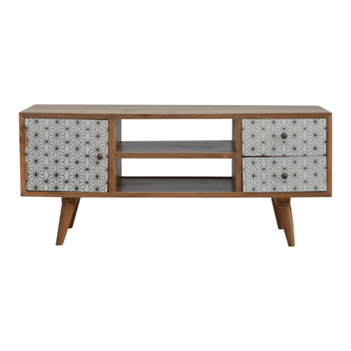 This 2-drawer media unit is crafted from 100% solid mango wood and finished with a sleek oak-inspired finish. Its standout feature is the screen-printed black and white geometric design on the drawer fronts and cabinet door, adding unique character and depth. The unit offers practical storage with open compartments and spacious drawers, perfect for organizing CDs, films, books, and more. Supported by four Nordic-style legs, it provides a sturdy base and ample surface space to accommodate TVs up to 44 inches.