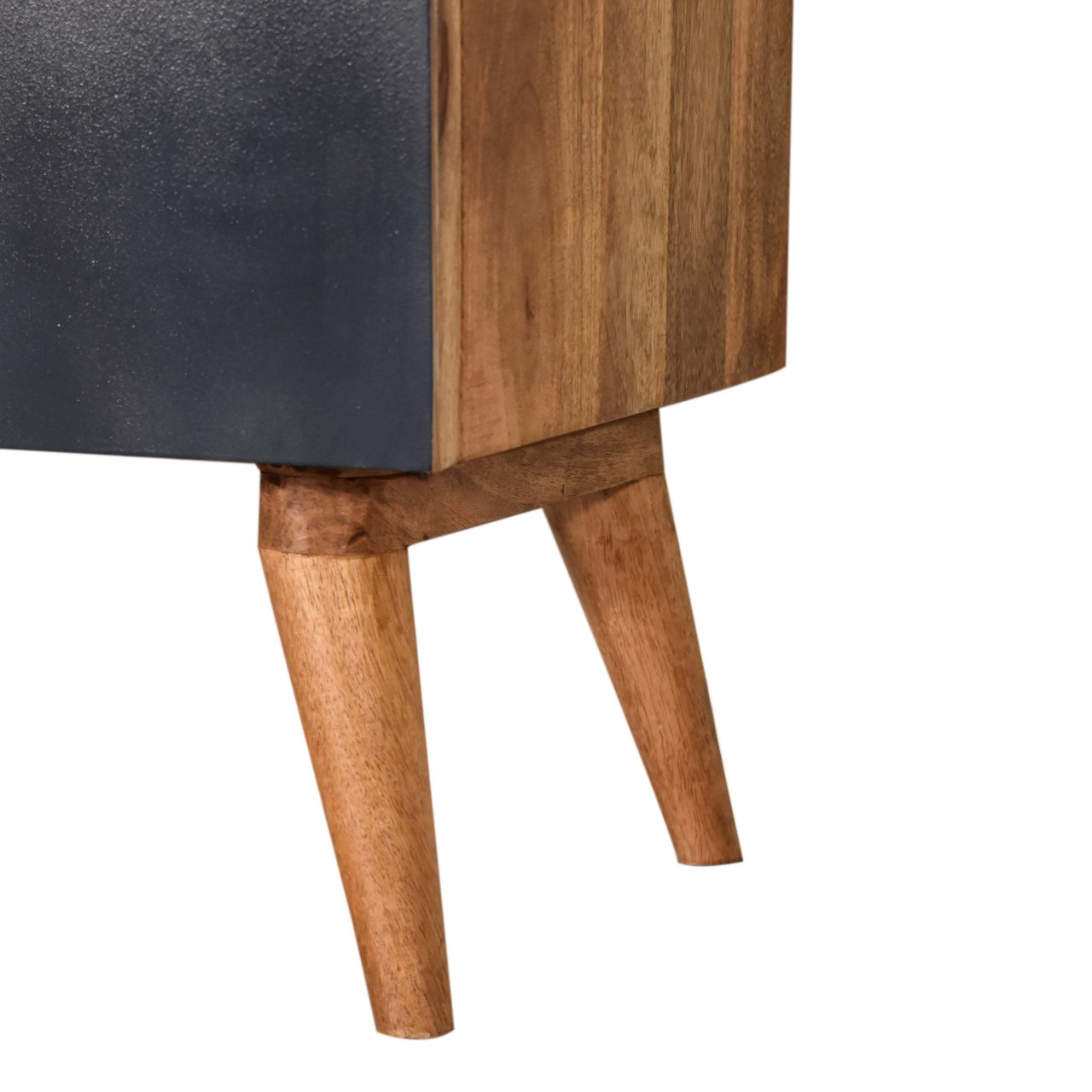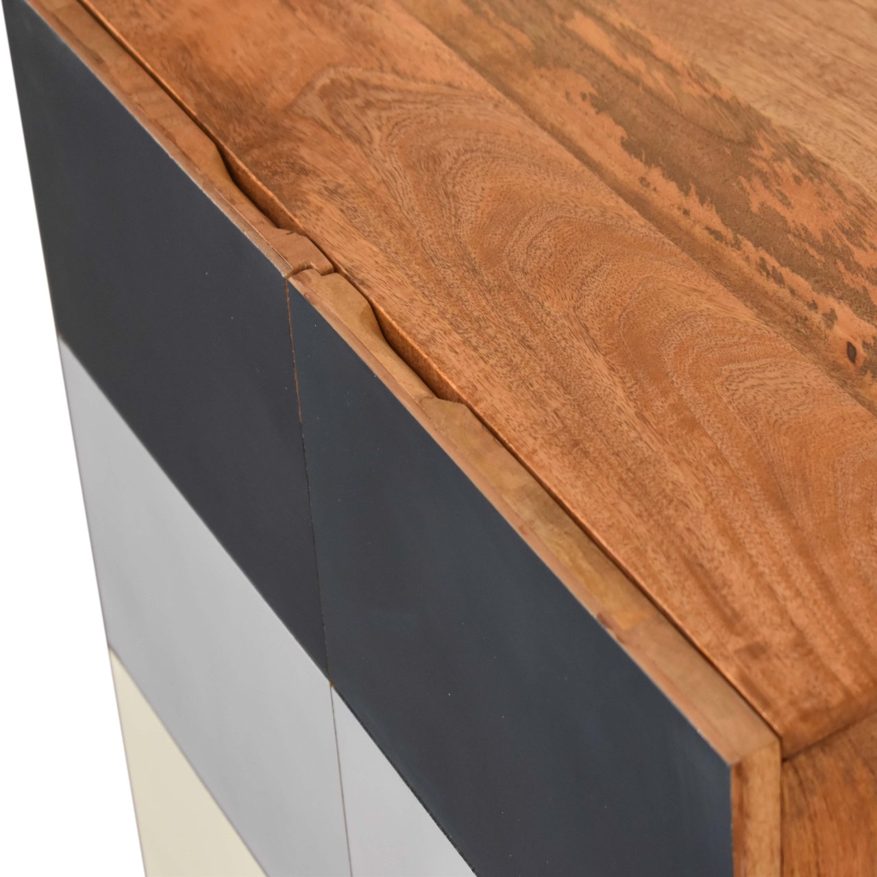 This stylish cabinet features a crisp, hand-painted L pattern in three vibrant shades of blue, adding a touch of elegance to any room. The spacious top provides the perfect spot for a candle, ornament, or plant, while the two-door storage compartment keeps your essentials organized and within easy reach. Crafted from 100% solid mango wood, the cabinet is supported by sleek Nordic-style legs, combining durability with modern design for a beautiful and functional piece.