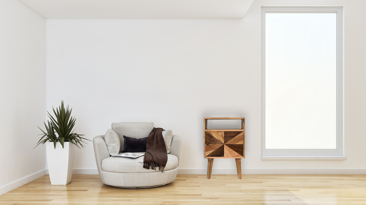Enhance your bedroom with the elegant Safi Bedside Table, showcasing a modern and stylish design. Crafted from 100% solid mango wood, it features a distinctive mixed wood door front that complements a variety of decor styles. This bedside table includes a convenient open shelf, a polished brass knob, and sleek Nordic-style legs, making it both functional and visually appealing.