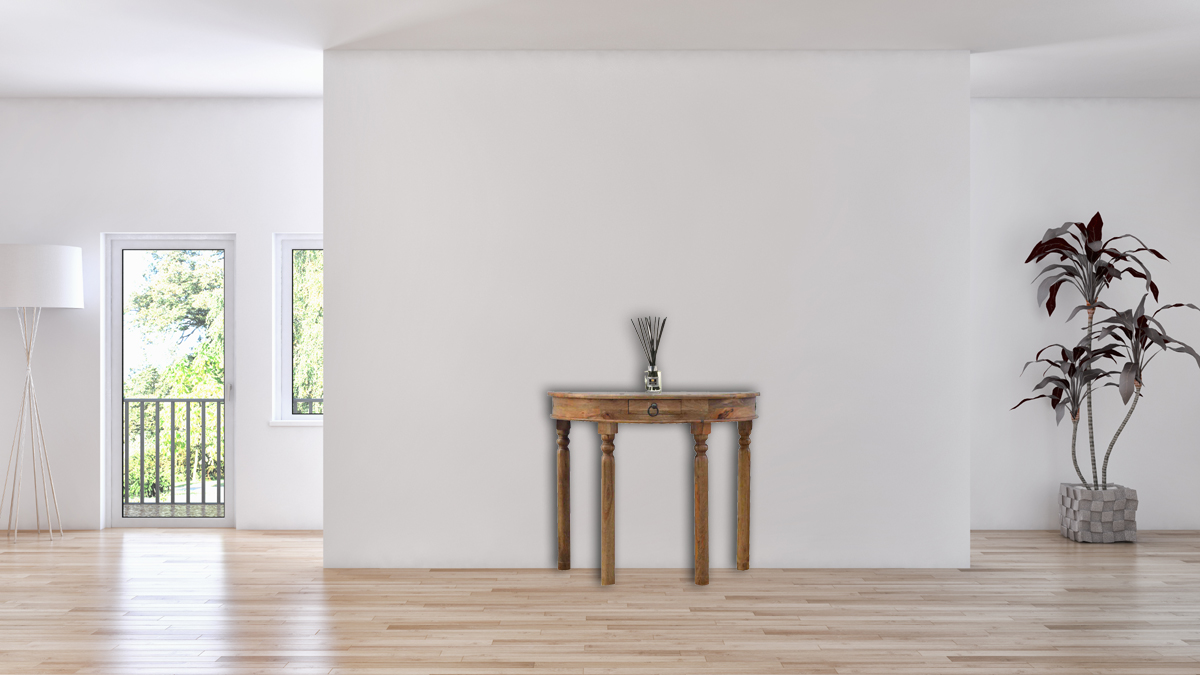 Crafted from 100% solid mango wood, this console table features a beautiful oak-inspired finish that adds warmth and character to any space. It stands on four elegantly hand-turned legs and includes a single drawer with a charming ring knob, perfect for storing small household items to keep your home neat and organized. A stylish and functional piece, this console table is the ideal addition to enhance your living area.
