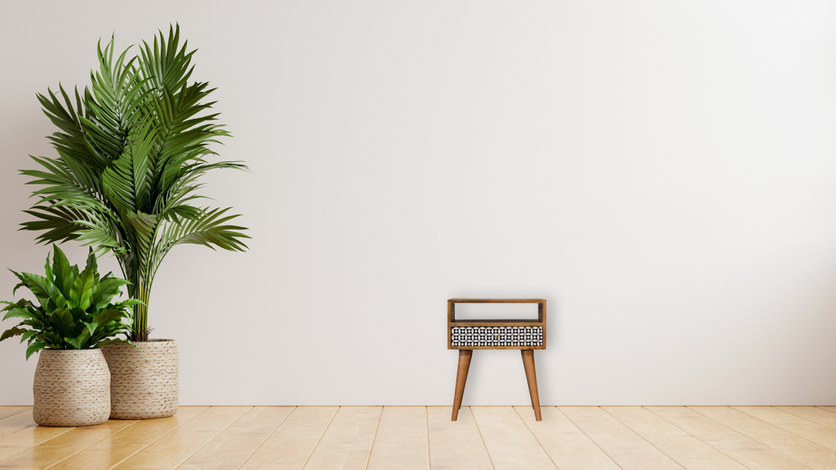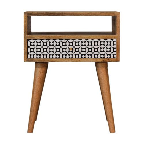 Crafted from 100% solid mango wood, this bedside table showcases a beautiful oak-inspired finish that adds warmth and elegance to your bedroom. The drawer front features a striking black and white pattern, perfect for adding a stylish touch while providing discreet storage for your essentials. An open shelf beneath the drawer offers additional space for books or other items. Supported by four sleek Nordic-style legs, this bedside table also provides ample surface area on top for a lamp, photo frames, or decorative accents.