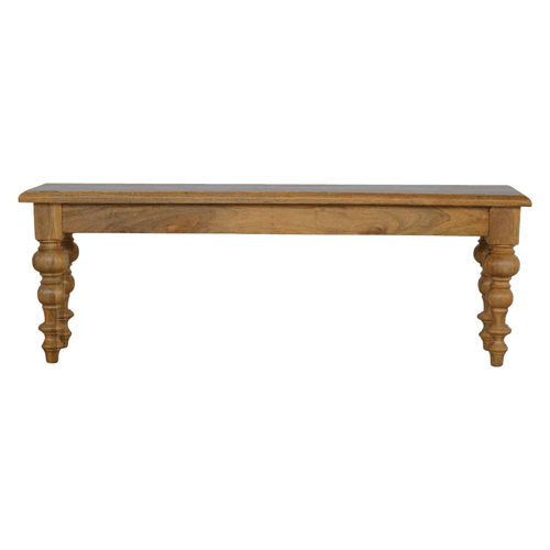 Crafted from 100% solid mango wood, this bench showcases a beautiful oak-inspired finish. It features elegantly hand-turned legs and a sturdy, thick top, making it versatile enough to serve as a dining bench or a stylish hallway seat. Each piece is individually handcrafted with care and comes with swing care tags detailing important precautions and aftercare instructions. This bench is the perfect addition to enhance the warmth and charm of any home.