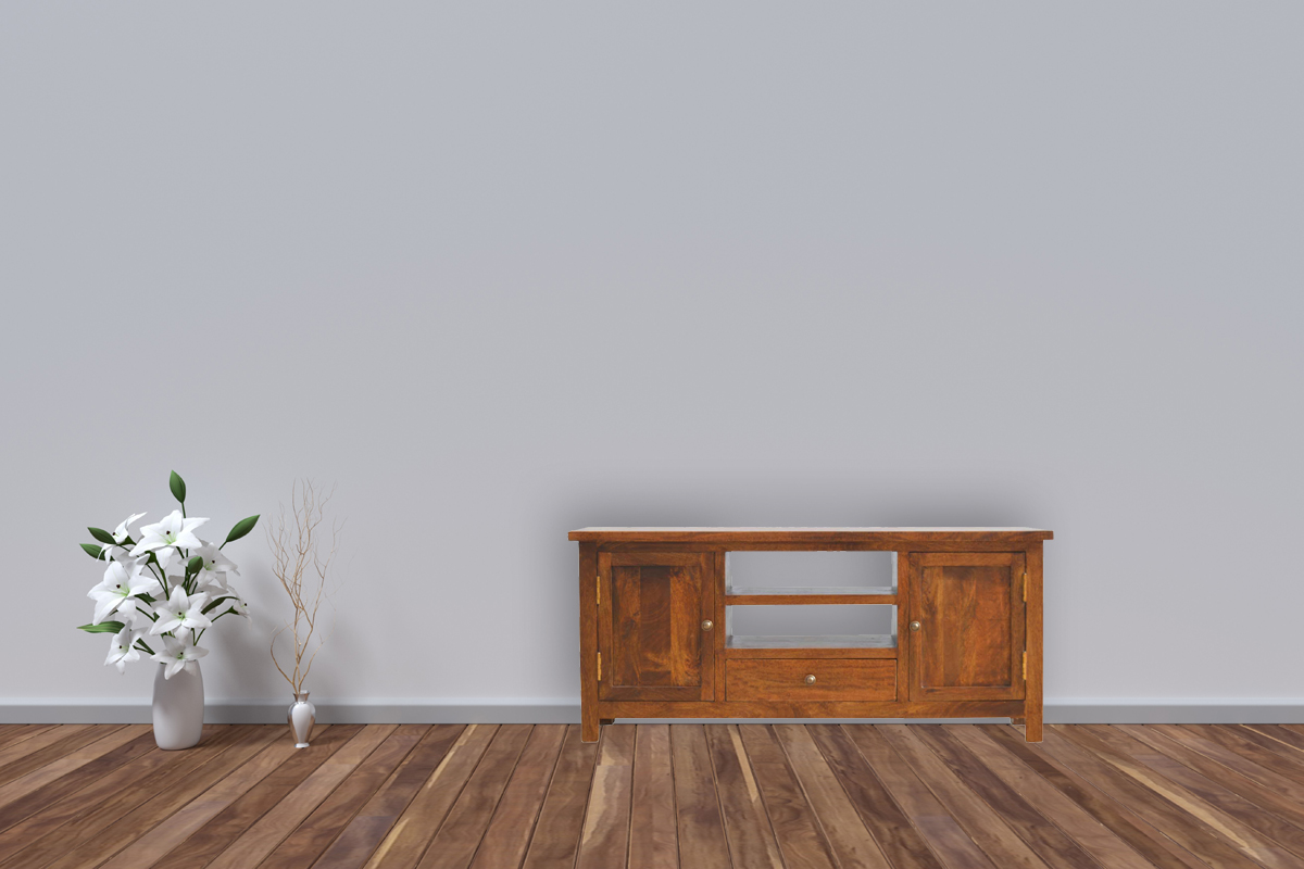 Crafted from 100% solid mango wood, our media unit showcases a beautiful light walnut finish and a clean, minimalist design that complements any home decor. It stands on four Scandinavian-style legs and offers ample storage with three spacious drawers, two open shelves, and two cabinet doors. Additional details include sleek round knobs and a generous tabletop, perfect for your TV or decorative accents.