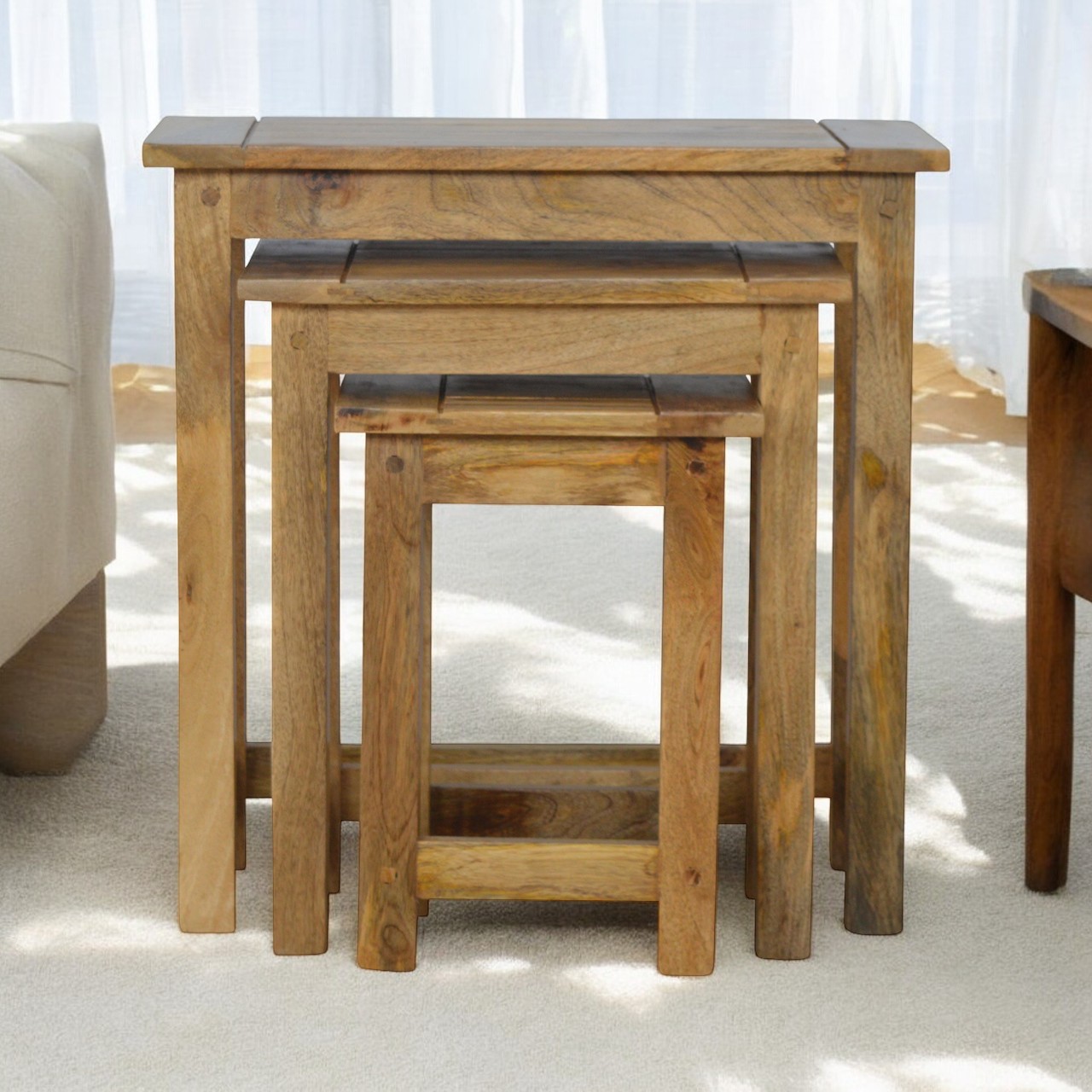 Crafted from 100% mango wood, these nesting tables offer sturdy and versatile extra surface space for everyday needs. Their compact design makes them ideal for small spaces, easily tucking away when not in use to keep your area clutter-free. Each table features a warm oak-inspired finish, complemented by wooden pegs, breadboard joints, grooves, and straight farmhouse-style legs. Additionally, these tables can double as stools, adding to their multifunctional appeal. Perfect for both practical use and stylish farmhouse charm.