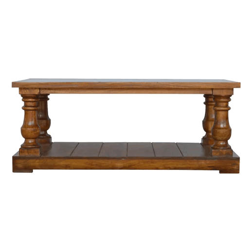 This coffee table is an ideal addition to any living room, showcasing a charming rustic country design with four turned legs for extra character. Crafted from 100% solid mango wood with a warm oak-inspired finish, it features a convenient lower shelf perfect for discreetly storing books, magazines, or paperwork. Its versatile design allows it to blend seamlessly with other furniture or stand out as a statement piece on its own.