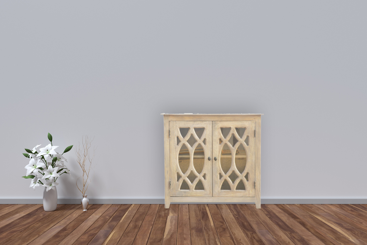 Crafted from 100% solid mango wood, this sideboard features a sleek acid-wash stone finish that adds a touch of elegance to any room. It offers ample storage with six open shelves, three spacious drawers, and two glazed door cabinets showcasing a beautiful solid wood pattern. The generous top surface is perfect for displaying photos, decorative items, or cherished keepsakes. Additional highlights include a sturdy plinth base, durable metal round knob handles, and a thick, robust top. Enhance your living space with this stylish and functional sideboard.
