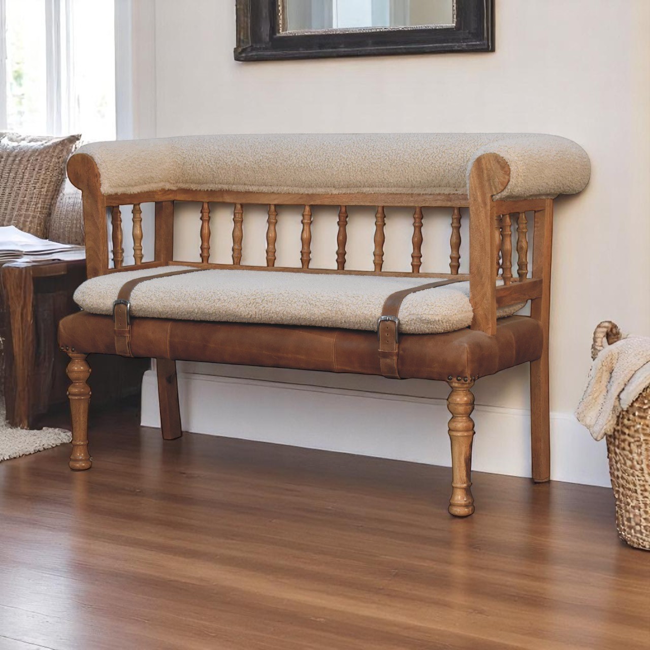 Elevate your home’s entryway with this exquisite carved hallway bench, a perfect blend of luxury and craftsmanship. Crafted from 100% solid mango wood, it boasts a rich oak-inspired finish that highlights the natural beauty of the wood grain. The seat and backrest are elegantly upholstered in sumptuous 100% cream boucle fabric, offering both comfort and style. Accentuated with genuine buffalo leather buckle straps that can be fastened or undone for a customizable look, this bench also features beautifully hand-turned front legs, adding a touch of timeless sophistication to your living space.