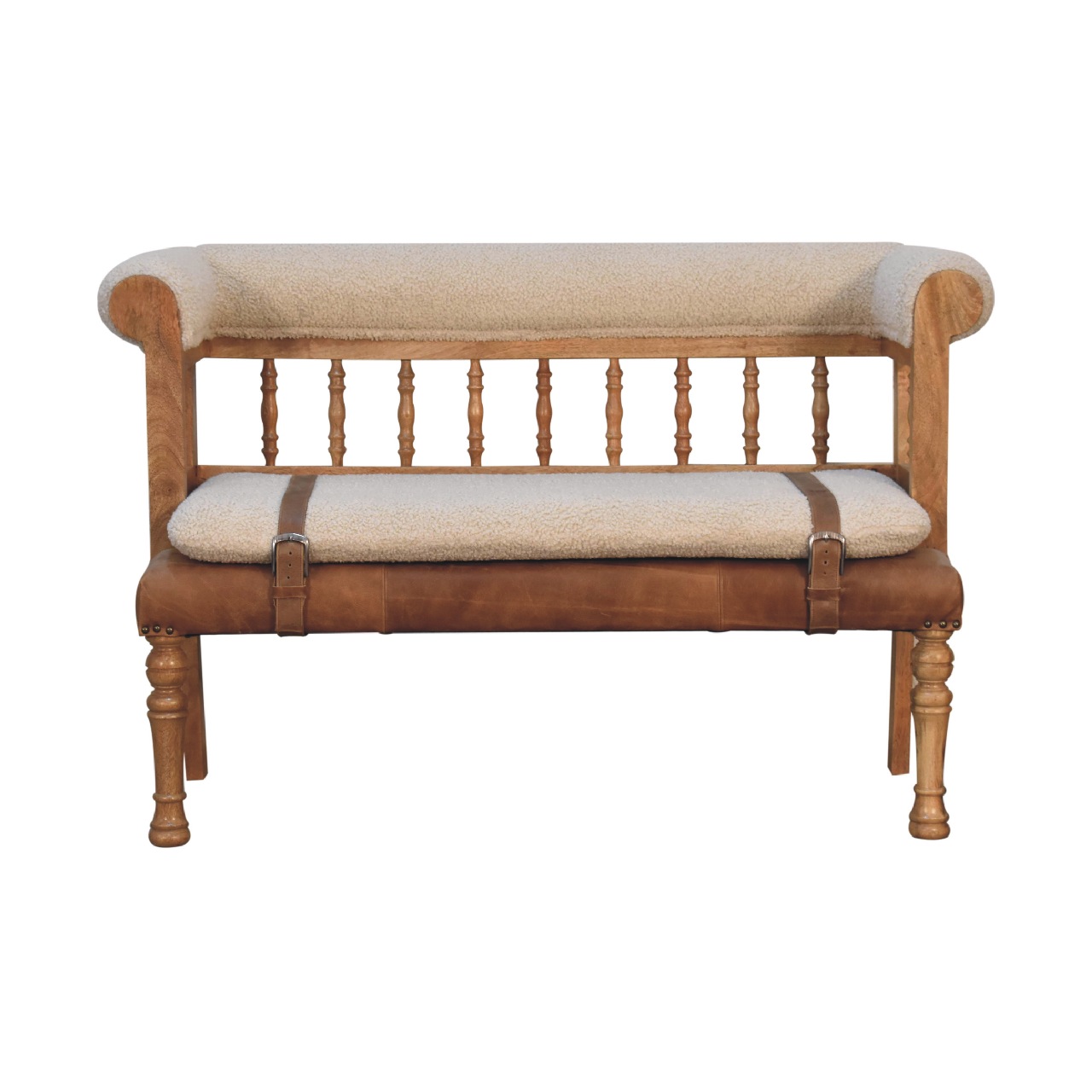Elevate your home’s entryway with this exquisite carved hallway bench, a perfect blend of luxury and craftsmanship. Crafted from 100% solid mango wood, it boasts a rich oak-inspired finish that highlights the natural beauty of the wood grain. The seat and backrest are elegantly upholstered in sumptuous 100% cream boucle fabric, offering both comfort and style. Accentuated with genuine buffalo leather buckle straps that can be fastened or undone for a customizable look, this bench also features beautifully hand-turned front legs, adding a touch of timeless sophistication to your living space.
