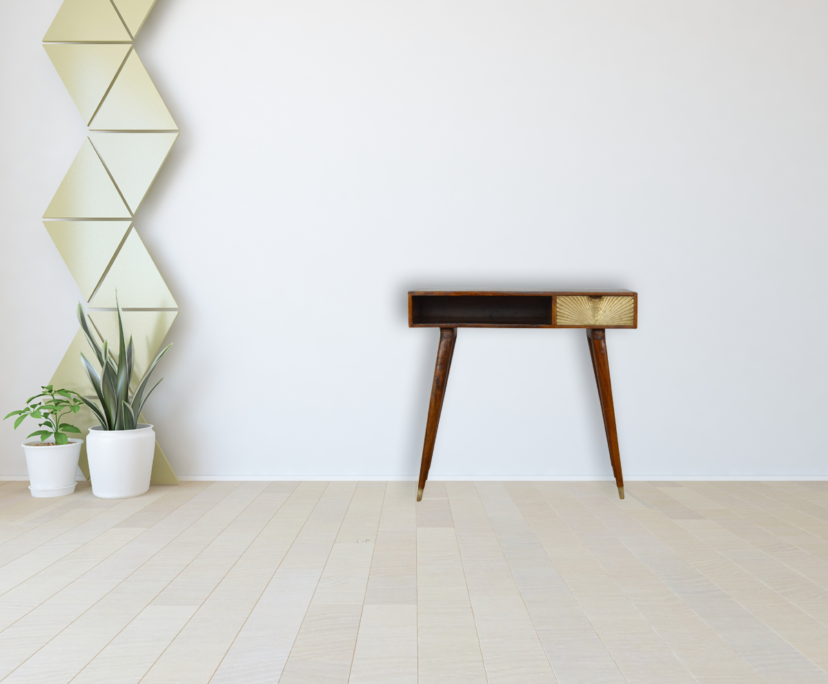 Crafted from 100% solid mango wood with a rich chestnut finish, this elegant writing desk is perfect for studying, reading, or writing. Its standout feature is the beautifully carved brass gold sunrise design on the drawer front. The desk includes an open storage slot for added convenience and is supported by sleek Nordic-style legs, each accented with four gold caps and a stylish pull-out handle.