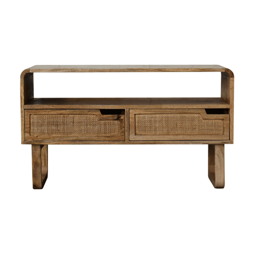 Elevate your living space with the Tallin Media Unit, a perfect blend of style and sophistication. Featuring a beautiful oak-inspired finish complemented by two rattan drawer fronts, this piece adds a warm, contemporary touch to any room. Designed for both function and aesthetics, it includes an open shelf, spacious cut-outs for easy drawer access, and sturdy U-shaped legs, making it a stylish and practical addition to your home.