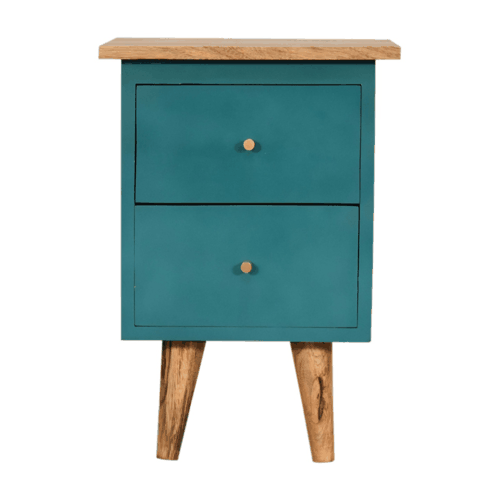 Crafted from 100% solid mango wood, this bedside table features a rich oak-inspired finish on the top and legs, complemented by a hand-painted teal body. Equipped with two drawers adorned with polished brass knobs, it offers both style and convenient storage. Add a vibrant touch to your bedroom with this striking bedside table.