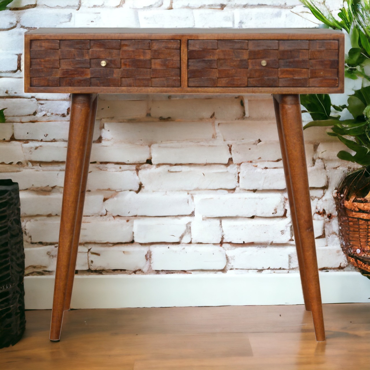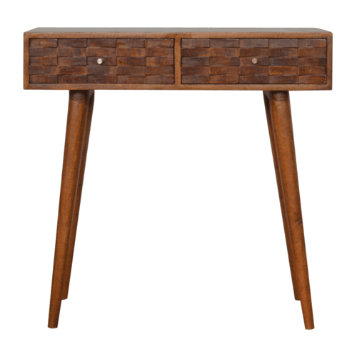 Crafted from 100% solid mango wood with a rich chestnut finish, this console table showcases Nordic-inspired legs and two drawers adorned with polished candle-shaped knobs. The drawer fronts feature a delicate hand-carved tile pattern, adding a modern touch to your space. Perfectly designed to complement the rest of the collection, this piece brings both style and functionality to your home.