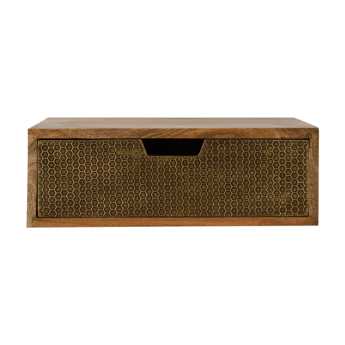 This wall-mounted unit is crafted from 100% solid mango wood with a beautiful oak-inspired finish. It features a single drawer with a unique honeycomb brass-plated front, designed with a convenient cut-out for easy access. Ideal for keeping your bedside essentials within reach, this sleek and minimalist piece mounts effortlessly on the wall, eliminating the need for legs. Please note: this unit is for storage only and is not designed to support sitting.