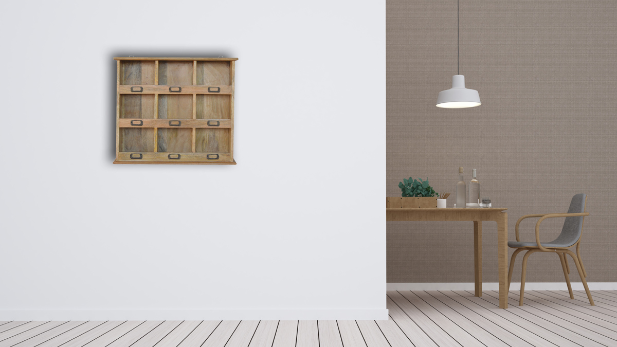 Introducing a neo-classic wall-mounted organizer featuring nine versatile slots designed for everyday use. This practical storage solution is perfect for the kitchen or any other space in your home. Each handcrafted metal slot, finished in elegant brass, allows you to label items by name or number for easy identification. Crafted from 100% solid mango wood, the unit showcases a beautiful oak-inspired finish, combining durability with timeless style.