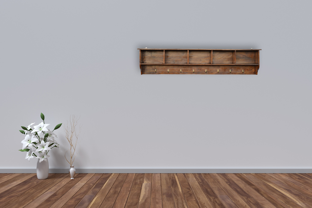 Enhance your hallway or corridor with this stylish wall-mounted storage unit that provides convenient storage without occupying any floor space. Crafted from 100% solid mango wood, it features antique brass hooks and a warm oak-inspired finish. The unit includes three open compartments, perfect for easily placing or retrieving your belongings as you head out the door. A practical and attractive addition to your home entryway.