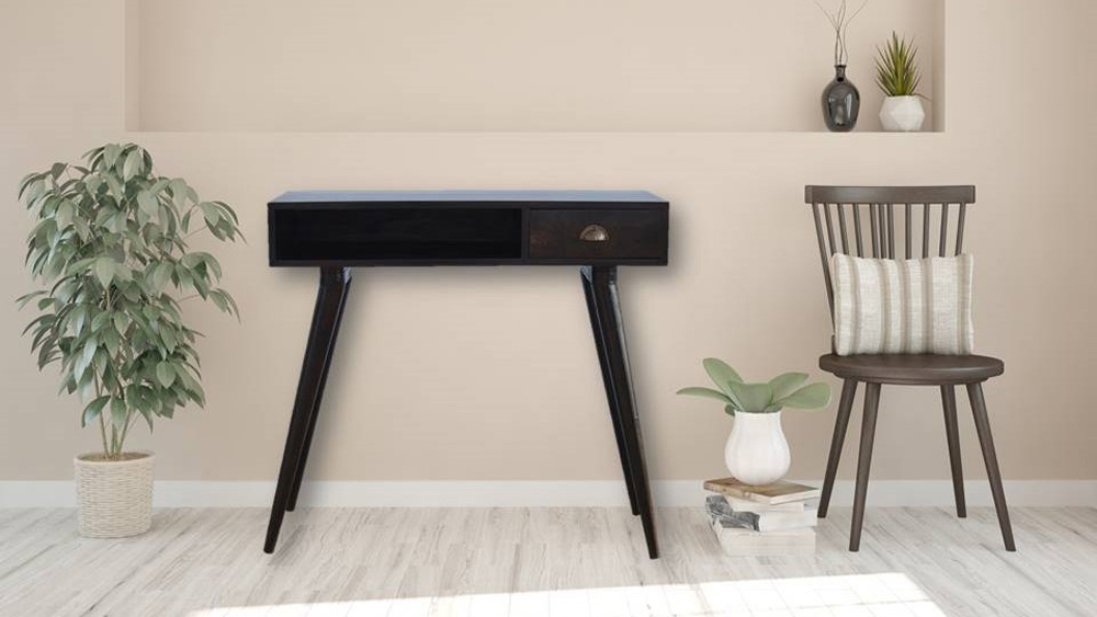 Blending vintage charm with modern elegance, this solid wood writing desk offers generous workspace for all your tasks. Crafted from 100% solid mango wood, it features sleek Nordic-style legs finished in a rich walnut tone. The desk includes a convenient open shelf and a drawer equipped with a stylish shell handle for added storage. Its clean, versatile design makes it an ideal addition to any home office or living space.