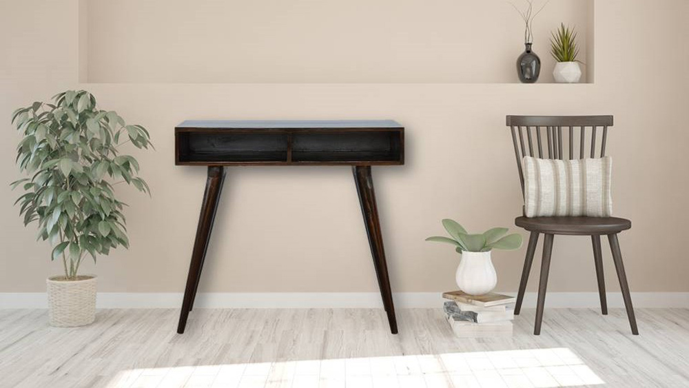 Combining both a modern and vintage style to furniture, this solid wood writing desk provides ample space for you to work on. It is constructed from 100% solid mango and has a rich walnut finish. Other features include 2 open shelves to place any notebooks, papers or stationary and a decent sized table top to work on or place a computer/laptop. The perfect addition to any home, with its clean design to suit most decors.