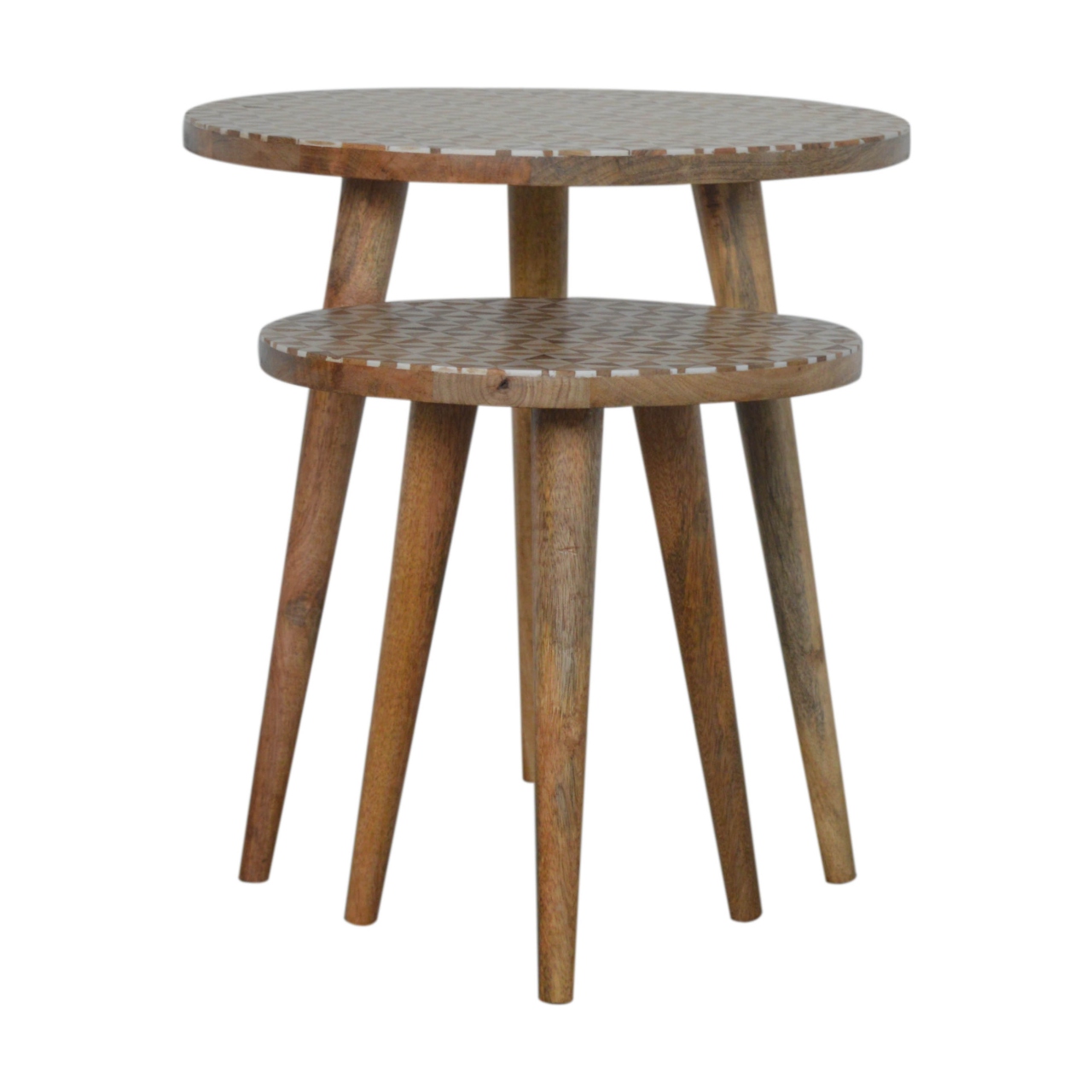 This set of 2 round stools features a sleek Nordic design and is crafted from 100% mango wood. Ideal for guest seating or daily use, these stools also double as stylish side tables, offering great versatility. Their compact size makes them perfect for small spaces, and they can be partially nested together for easy storage.