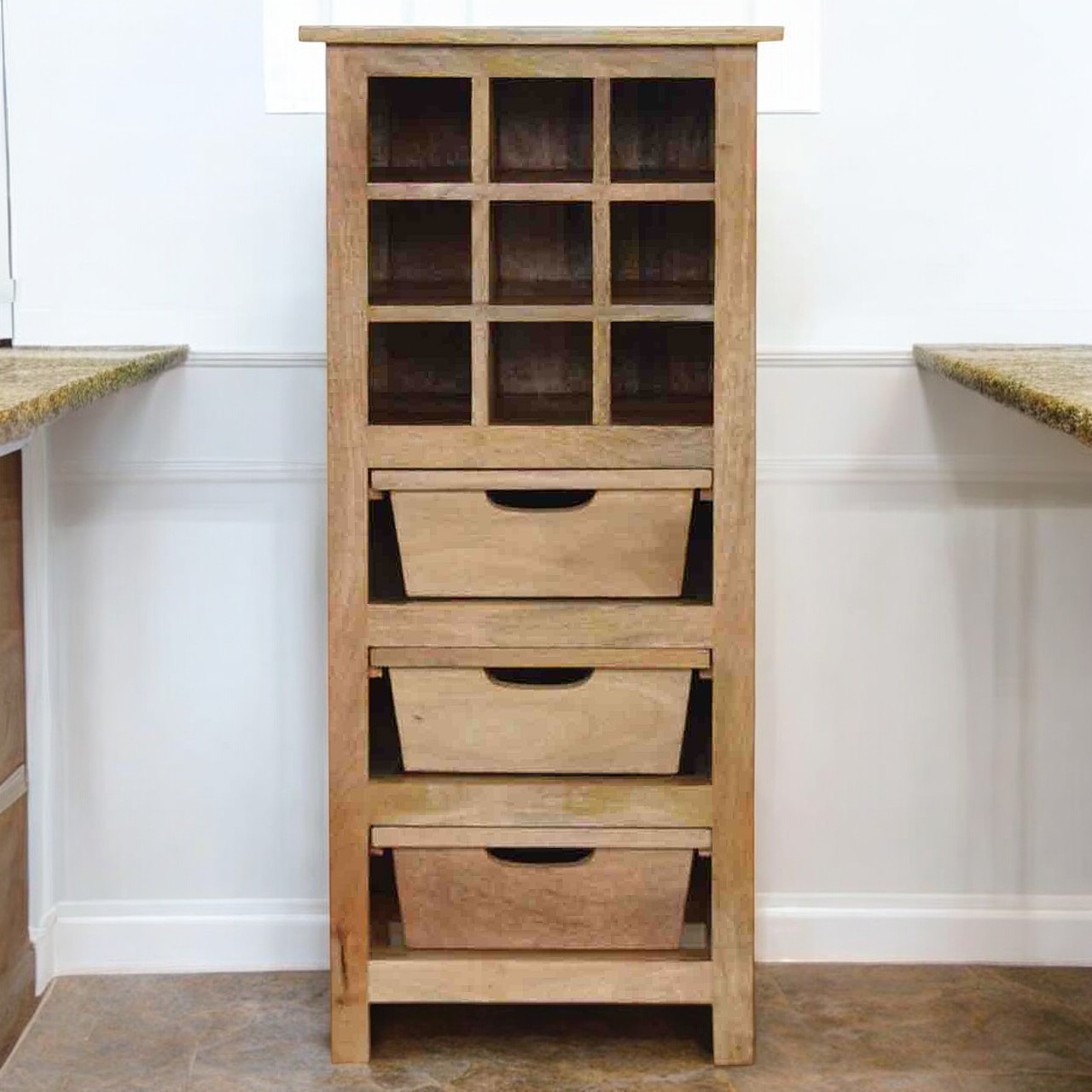 Introducing this exquisitely handcrafted cabinet, expertly crafted from 100% solid mango wood with a rich oak-inspired finish. Featuring three spacious drawers and nine dedicated wine bottle slots, it provides the perfect storage solution for your wine collection, kitchen essentials, and miscellaneous items. The lower three shelves offer ample space for groceries or everyday kitchen accessories. Designed for durability and practicality, this cabinet is a timeless addition to any kitchen or dining room. Each piece is uniquely handmade and comes with detailed care instructions to ensure long-lasting beauty and functionality.