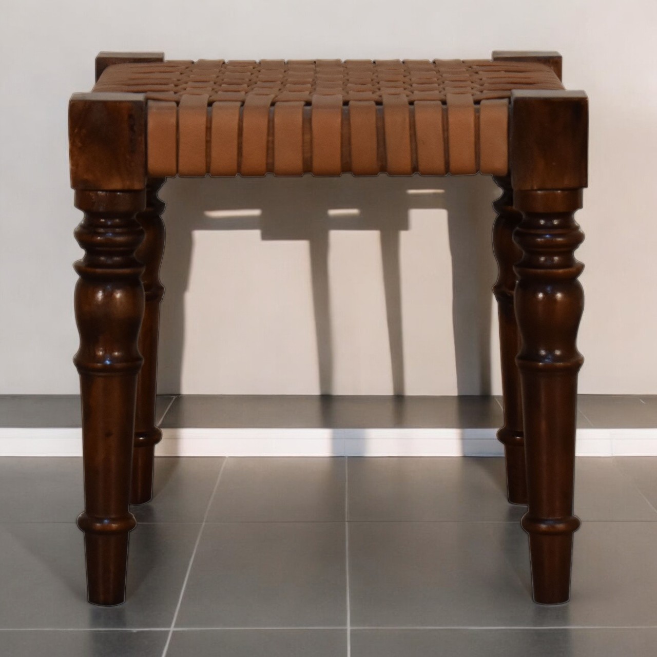 Crafted from 100% solid mango wood, this footstool features a charming country-style design with a rich chestnut finish. Its handcrafted construction highlights the natural beauty of the wood, while the woven leather top adds a stylish contrast and comfortable surface. A perfect blend of rustic elegance and functional comfort.