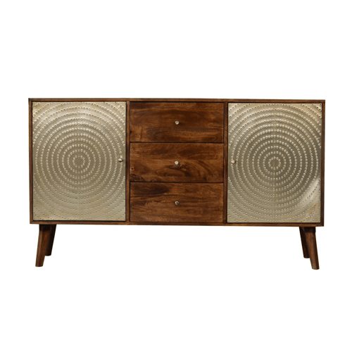 Elevate your bedroom décor with our stunning Zen Sideboard. Showcasing decorative brass doors adorned with a captivating cut-out dotted pattern, this piece beautifully contrasts with a rich chestnut finish. Accented by gleaming brass knobs and sleek Nordic-style legs, it effortlessly brings a touch of sophisticated Art Deco charm to your space. Perfect for those seeking a stylish and unique statement piece for their home.